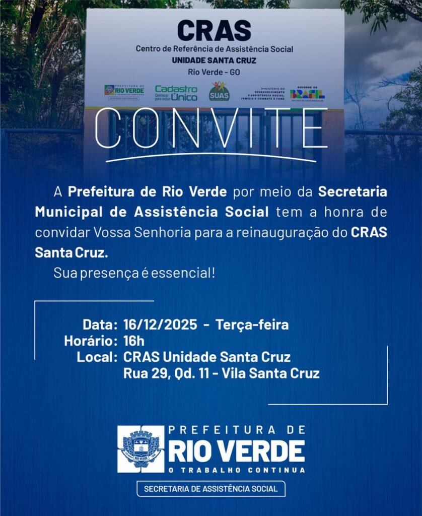 A Prefeitura de Rio Verde realiza, nesta terça-feira (16), às 16h, a reinauguração do CRAS Santa Cruz, espaço que passou por revitalização para ampliar o cuidado, o acolhimento e a qualidade do atendimento prestado às famílias da região. A cerimônia é aberta ao público e marca mais um avanço nas políticas de assistência social do […]