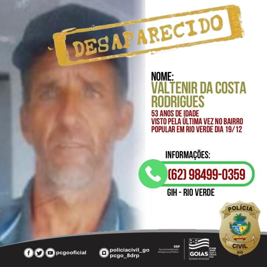 A Polícia Civil (PC) de Rio Verde divulgou o desaparecimento de Valtenir da Costa Rodrigues, de 53 anos, que não é visto desde o dia 19 de dezembro. O caso mobiliza familiares e autoridades, que pedem a colaboração da população para ajudar nas buscas. De acordo com a PC, Valtenir foi visto pela última vez […]