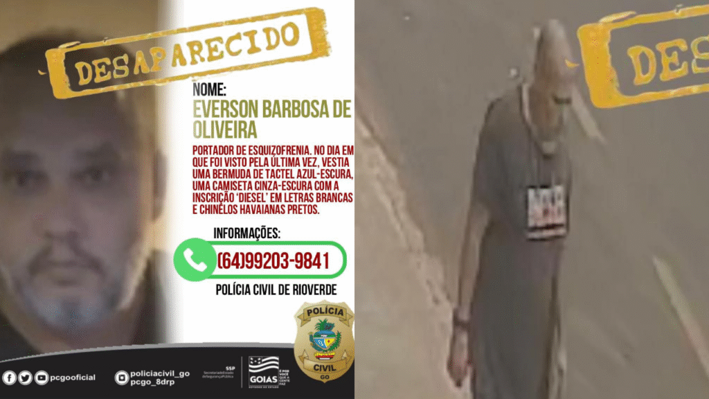 A Polícia Civil de Montividiu registrou um boletim de ocorrência sobre o desaparecimento de Everson Barbosa de Oliveira, de 49 anos, ocorrido na cidade. Segundo as informações oficiais, Everson não é visto desde sábado, 07 de fevereiro de 2026, o que mobilizou as autoridades locais. Segundo informações oficiais, Everson é portador de esquizofrenia, o que […]
