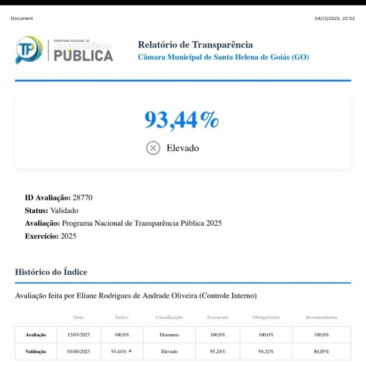 A Câmara Municipal de Santa Helena de Goiás alcançou o 1º lugar no Ranking da Transparência 2025 do Tribunal de Contas dos Municípios de Goiás (TCM-GO), consolidando-se como o Poder Legislativo mais transparente entre os 246 municípios avaliados no Estado. A classificação reforça o compromisso do órgão com a divulgação clara e acessível de informações públicas, seguindo normas nacionais de transparência ativa.