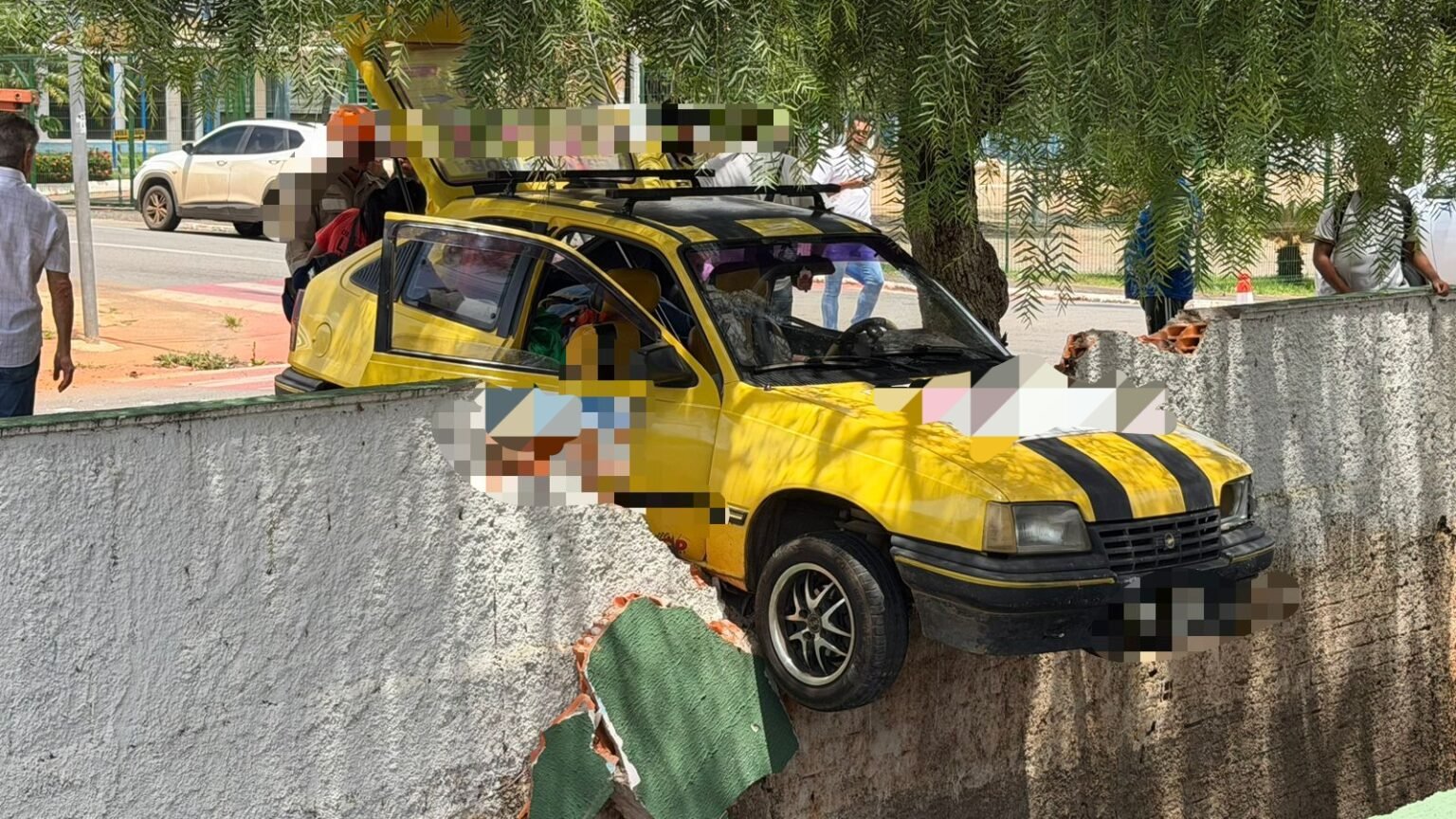 Uma colisão entre dois veículos de passeio deixou um carro parcialmente suspenso sobre a mureta de proteção de um córrego na