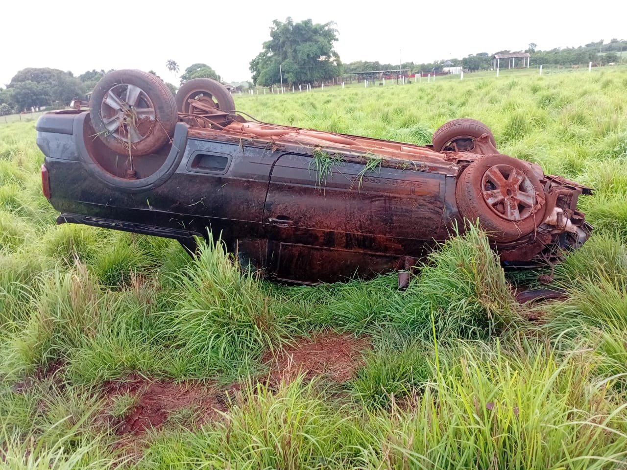 Um carro (Jeep) tombou na tarde desta sexta-feira (12) na Rua Castro Alves, no Centro de Jataí, depois de bater em