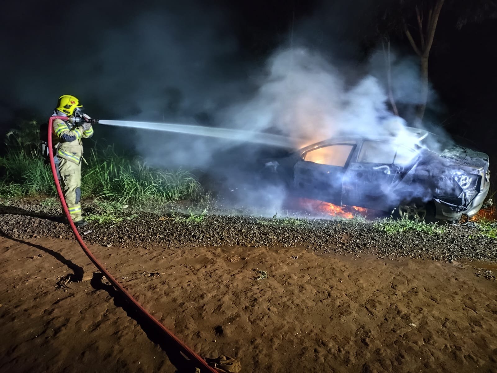 Um incêndio urbano mobilizou o Corpo de Bombeiros Militar na noite desta segunda-feira (27), após um veículo pegar fogo na zona