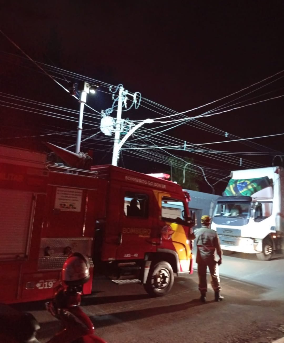 Dois homens viveram momentos de tensão na noite desta sexta-feira (23), após um caminhão baú ficar enroscado em fios da rede