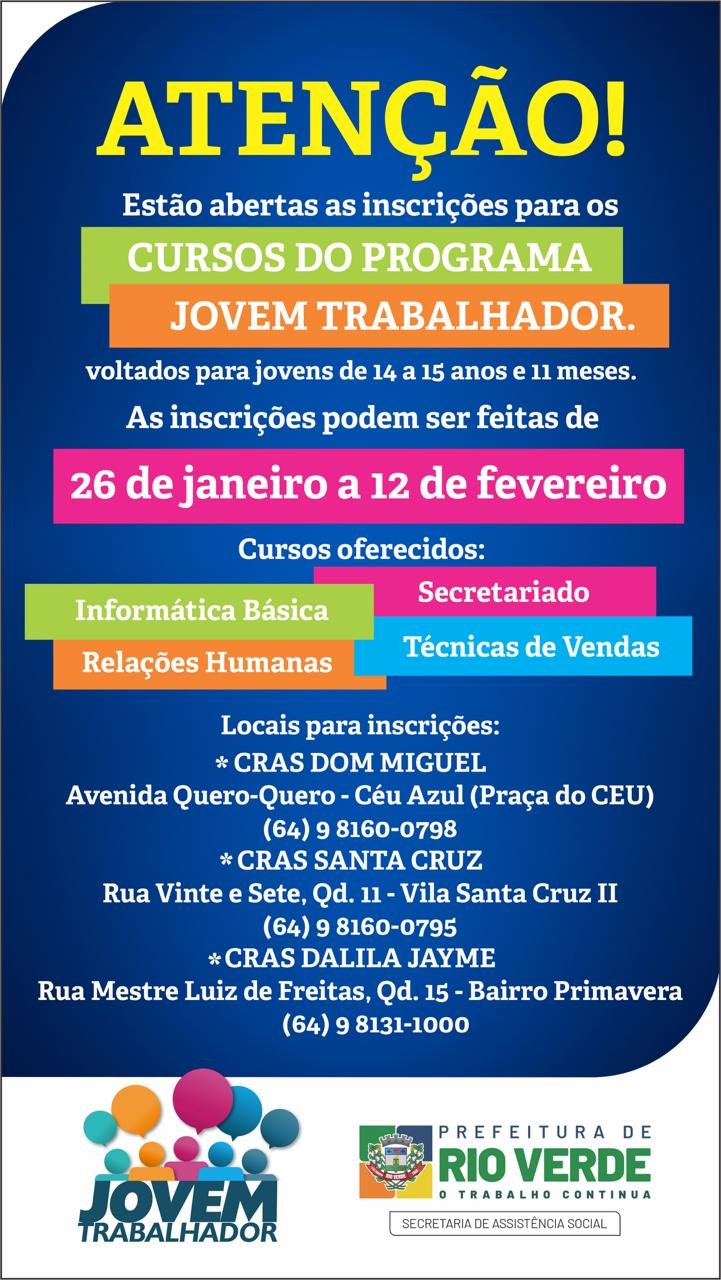 A Prefeitura de Rio Verde inicia nesta segunda-feira, dia 26, as inscrições para o Programa Jovem Trabalhador, uma das principais iniciativas