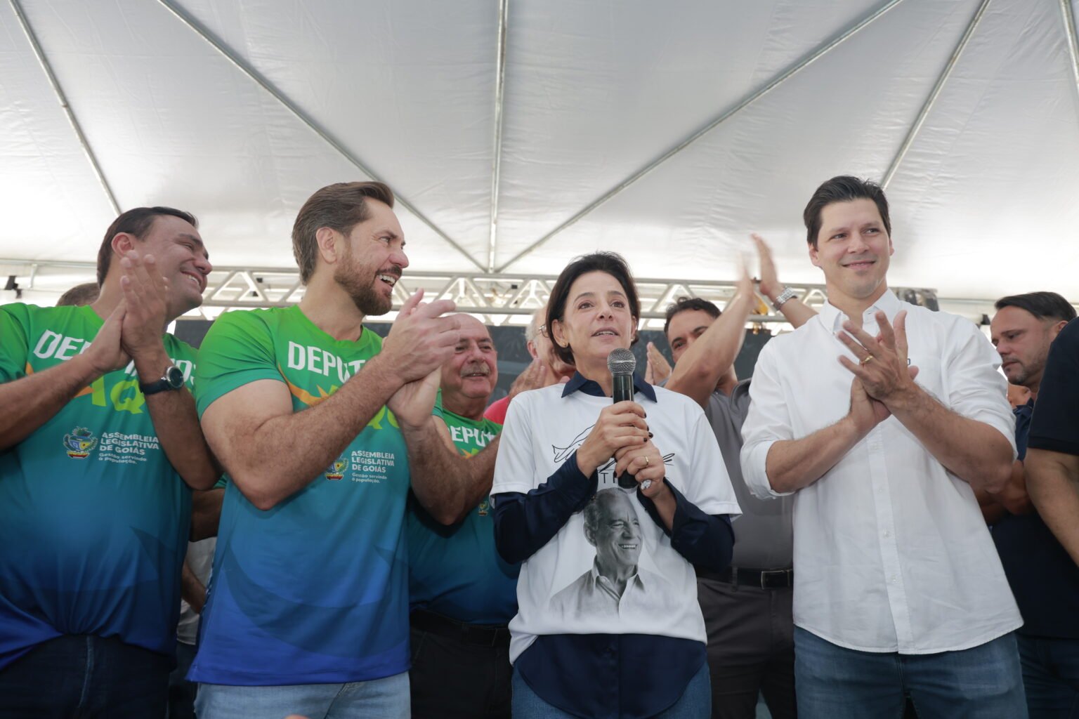 A pré-candidata subiu ao palco ao lado do presidente da Assembleia Legislativa de Goiás, Bruno Peixoto, do vice-governador Daniel Vilela e do prefeito de Goiânia, Sandro Mabel. A composição política do evento foi interpretada como um sinal de alinhamento e apoio inicial de lideranças influentes, indicando que o nome de Ana Paula já circula com força nos bastidores.