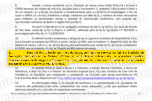“A Qualitours informa que foi contratada pela Embratur para operar navios de hospedagem de apoio à COP, em processo regular e compatível com as exigências técnicas do projeto. A empresa reafirma a conformidade da contratação e dos serviços”, informou a empresa. (Metrópoles)