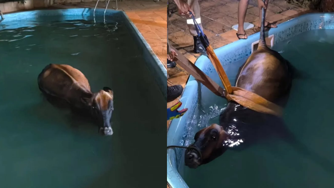 Após ser retirada da piscina, a vaca foi entregue aos cuidados do solicitante da ocorrência. Segundo os bombeiros, o animal não apresentava ferimentos aparentes.