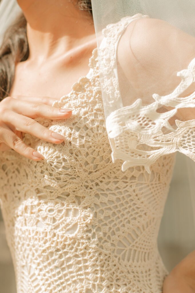 Para finalizar o visual, o vestido recebe uma mantilha em tule leve com acabamento em renda gripir de algodão. O detalhe amplia o caráter bucólico e poético da cena, reforçando a estética de delicadeza artesanal que marca o trabalho da marca.